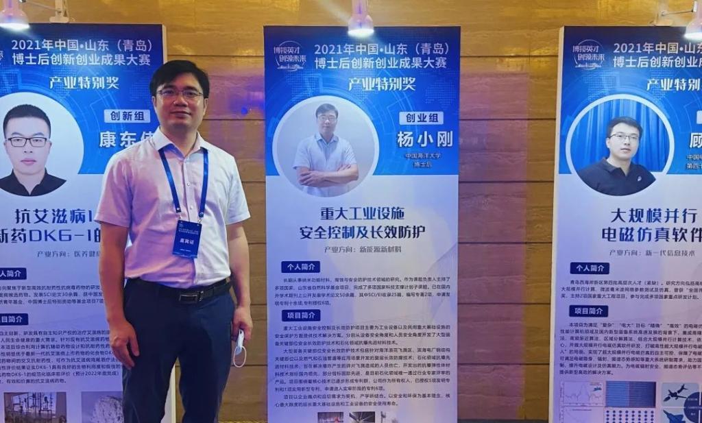 此外,在9月份举办的2021年中国·山东(青岛)博士后创新创业成果大赛中,杨小刚老师凭借自身实力斩获“新能源新材料产业特别奖”。