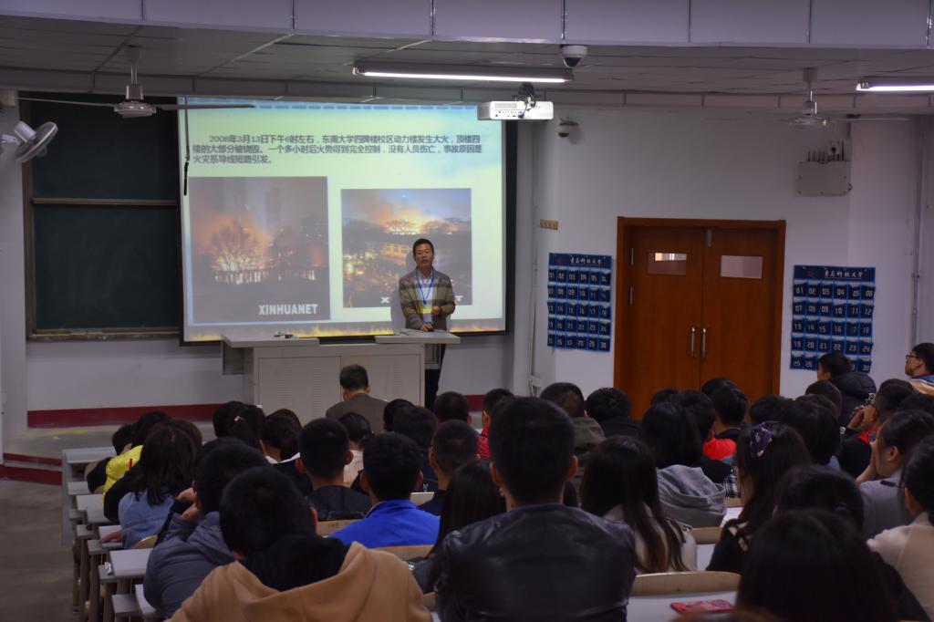 活动中,严增兴为大家做了“关注消防安全·共创平安校园”的消防安全讲座。他结合自身近十年的消防安全工作经验,围绕宿舍安全和实验室安全两个方面,以数起真实事件为案例,从烟头、大功率发热电器等宿舍常见违规物品的安全隐患,到高压气瓶无固定底座、高温仪器运行无人看守等实验室违规操作,深入浅出地将安全观念根植于学生内心,起到了良好的示范效果。同时,他还从实际出发,为学生详细介绍了火情处置方式和安全逃生方法。