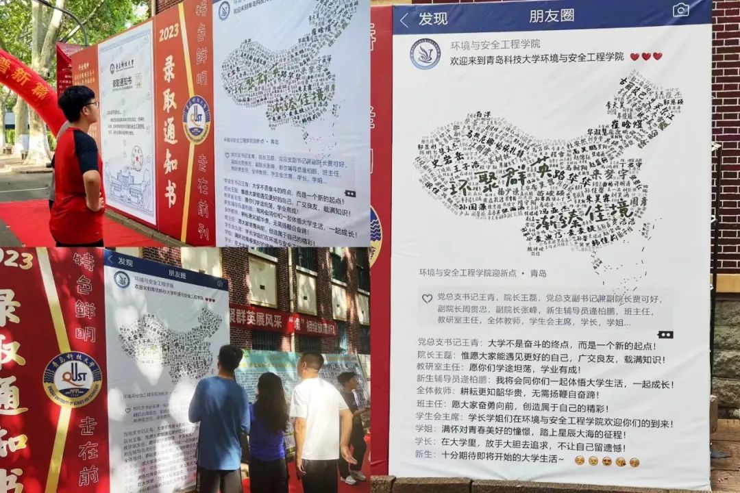 本次迎新工作贯穿思政元素,营造了青年学子爱党、爱国、爱校、爱院的良好氛围。学院制作了印有“环聚群英 渐臻佳境”迎新主题的“录取通知书”喷绘和以268名新生花名册绘制而成的中国地图“朋友圈点赞”展板,吸引了来自全国191个城市的新同学与学校“科大精神”“橡胶品格”“五有理念”等科大元素“同框”,上好新生思政“开学第一课”。学院选取了具有独特建筑风格的南二门、校园特色景点等照片为底板,精心打造了“拼图认门”的互动环节,切实推进爱校荣校教育第一时间进新生。学风是大学精神的集中体现,学院将历届环境学子薪火相传的“学霸现象”跃然纸上,连续9年涌现出的16个考研“学霸宿舍”风采展和2023考研龙虎榜,着力发挥朋辈示范引领作用,指引新生立志起航。此外,迎新现场搭建学生工作成果展示展板和特色文化长廊,将近年来学院在各方面取得的成绩制成便笺悬挂展示,成为一道靓丽风景。